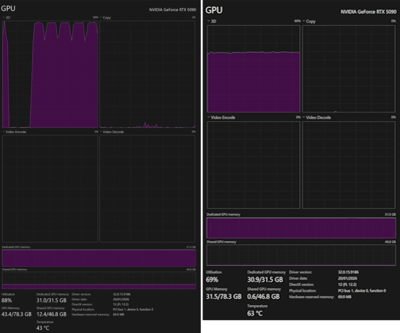 Left: VRAM is full, and usage has spilled into a significant amount of Shared GPU Memory (system RAM). But the GPU is happily crunching at 100%. Right: VRAM is full, and the GPU is slowing down at 60%.