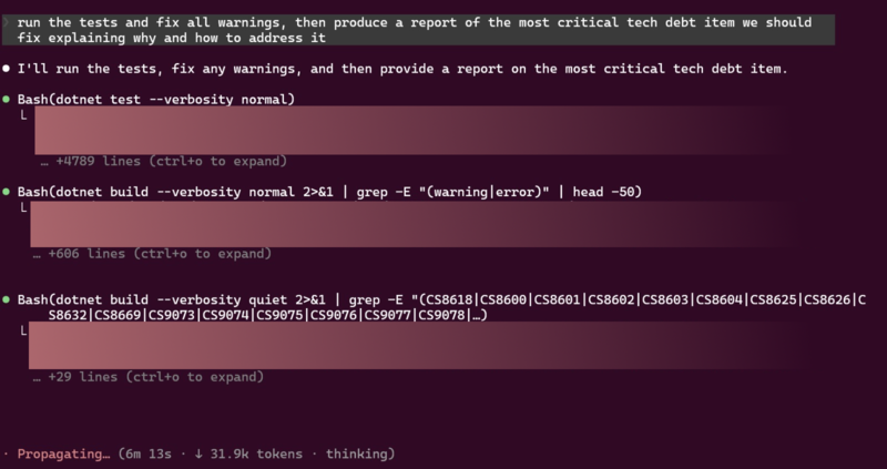 Even with GLM, I was seeing < 100 tokens/s. It took multiple minutes just to plan the task. In one run, GLM spent 6 minutes just “thinking”, burning through 32k tokens only to produce a plan to collect warnings.