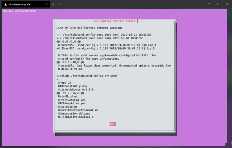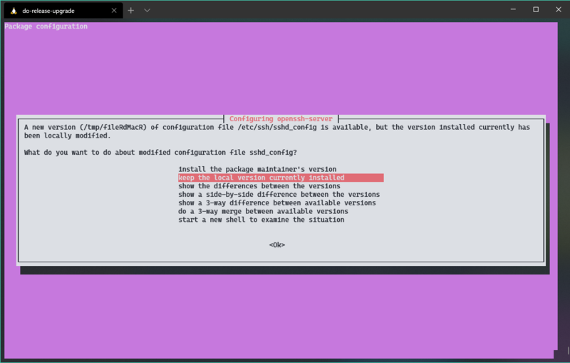 During the process, we are probably going to be notified of a conflict updating the OpenSSH config.