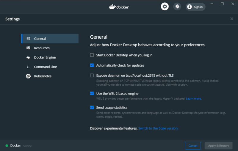 If you had Docker Desktop already running, you have to first close it to get this prompt. Otherwise, you can always right-click on the system tray Docker icon, select Settings and, from the General tab, tickUse the WSL2 based engine, then confirm with Apply and Restart.