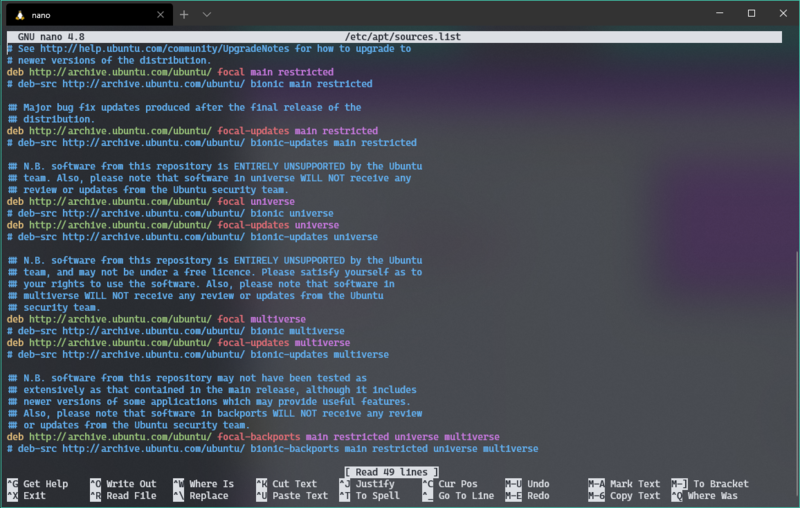 This file contains the repositories to use when downloading packages. We can review it scrolling with the arrow keys. Ignoring the comments, identified as usual by the # sign, we are going to find various entries which have been updated to point to focal, which is the codename of Ubuntu 20.04.